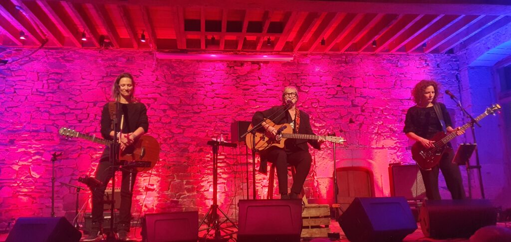 BJ était entourée de deux artistes talentueuses qui jalonnent son parcours depuis quelques temps déjà : Skye (Élodie de son vrai prénom) assure l’alternance entre guitare (… de plus gauchère… »Bonjour la transposition des accords » sur le manche !) , batterie/percussions et voix au sein de ce trio, apportant une dynamique vivante et complémentaire , dont la sonorité de la batterie, jouée avec le talon sur une pédale de commande … Chapeau !