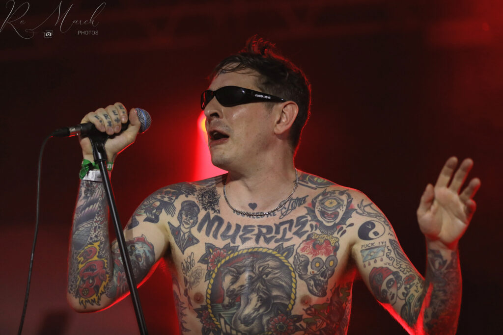 On ne connaissait pas avant de se rendre au Cabaret Vert. Et bien, nous ne sommes pas prêt de les oublier, ces Viagra Boys. Il y a d’abord ce nom, évidemment, qui fait référence à une petite pilule bleue qui a défrayé les chroniques voici quelques années. Mais il y a surtout une dégaine que l’on ne s’attend pas nécessairement à voir apparaître sur scène. A vrai dire, aucun membre du groupe ne paye de mine au premier regard, mais quelle énergie ! Le chanteur débarque torse nu, une bière à portée de main, et sa paire de lunettes de soleil bien fixée sur le nez. Dès les premières notes de musique, il se dandine sans porter attention au public qui lui fait face. C’est parfois disgracieux, l’artiste n’ayant pas vraiment le physique d’un danseur étoile de l’opéra, mais il se donne à 110 %, et ça, les festivaliers apprécient. Mais, en fait, quelle musique jouent-ils? Viagra Boys est un groupe de post-punk suédois formé en 2015 à Stockholm par Sebastian Murphy (chanteur) et Henrik Höckert (bassiste). L’idée du groupe aurait germé lors d’une soirée karaoké organisée dans le salon de tatouage où les deux sont employés à l’époque (le torse du chanteur donne effectivement à lui seul une sérieuse indication). En 2016 et 2017, ils publient les deux EP Consistency of Energy et Call of the Wild, sur le label suédois Push My Buttons. Pour leur premier album, Street Worms en 2018, ils signent un contrat avec Year0001 Records, les mettant sur le même label que le rappeur suédois Yung Lean. L’album reçoit des critiques enthousiastes et figure notamment dans le classement de fin d’année du magazine britannique NME. Les morceaux Sports et Just Like You gagnent suffisamment de lectures en streaming et de vues vidéo pour élever leur public au-delà de l’underground. Par la suite, Elias Jungqvist remplace Martin Ehrencrona aux claviers. En avril 2020, les Viagra Boys publient un EP de quatre chansons intitulé Common Sense. Sur scène, on vous l’a dit, c’est assez déjanté car Sebastian part un peu dans tous les sens, s’aspergeant même de bière en pleine prestation, mais le concept plaît visiblement puisque nos joyeux Suédois ont notamment été invités à Rock Werchter et Rock en Seine lors de cette saison alors qu’en 2022, ils étaient déjà repérés au Botanique. Retrouvez les photos de ce concert et de nombreuses autres performances du Cabaret Vert sur la page FaceBook – ReMarck Photos.