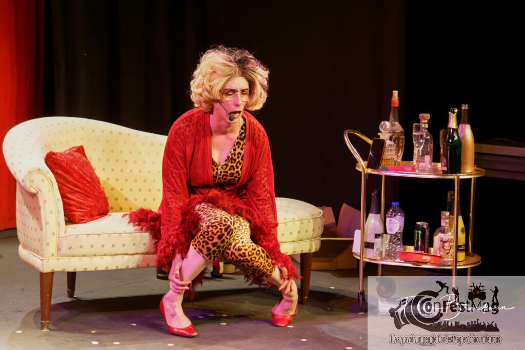 Evelyne Demaude nous a enchantés avec son premier seule-en-scène « Marie Patrick vous parle », un personnage à l’humour corrosif et jubilatoire ! C’est dans le cadre des Nuits du Magic Hall au Magic Land Théâtreque se produisait Evelyne Demaudedans son premier seule en scène Marie Patrick vous parle. Une veuve plutôt aristo, belge, à l’âge indéfini et haute en couleurs, nous présente son ´live ´en live. Autant vous le dire tout de suite, on a adoré ! La soirée a débuté avec environ trente minutes d’un Jérémy Leruitte alias Oncle Nis qui ne m’a pas laissé une grosse impression. Avec un voyage anatomique et introspectif bien barré il tente de nous faire rire avec un humour qui n’appartient qu’à lui. Personnellement j’ai souri de temps à autre, mais jamais il ne m’a attrapé avec ses pensées virevoltantes et un débit irritant qui ne laisse place à aucun temps mort. Pour moi hélas, un coup dans l’eau . Après l’entracte, place maintenant à Marie Patrick et son spectacle haut en couleurs. Sur scène un canapé, un bar, une table pour le maquillage, des ballons suspendus, et une Evelyne Demaude qui dès les premiers instants nous installe dans son univers. Elle nous présente son live « en live ». Aristo déjantée, Marie Patrick Ducolvert, son personnage, est haute en couleurs. Sur scène, Evelyne oscille entre un jeu clownesque, caricature les traits de son personnage jusqu’au grotesque, et appuie parfois là où ça fait mal. On s’attache vite à cette fofolle excentrique qui évolue devant nos yeux sans filtre et avec talent. Car tout ça est bien écrit, et la force comique d’Evelyne fait le reste. À lire aussi | VIDÉO| En une choc du récent magazine Loser, les déchaînées Girls Next Door (Evelyne Demaude et Ann Vandenplas) font monter la température avec leur freestyle sexuel À lire aussi | Après avoir mesuré les boules de l’Atomium, les Girls Next Door sont toujours aussi détonantes entre Neder-Over-Heembeek et Malonne, entre La La Land et Disney… en moins glamour Comédienne de théâtre, mais aussi de cinéma, on a pu la voir récemment dans la série à succès Ennemi Public dans un tout autre registre dramatique dans lequel elle brillait tout autant. Issue de l’I.A.D., et ayant construit son bagage artistique en Angleterre, aux USA notamment au Broadway Dance Center, ainsi qu’avec des stages intensifs de clown et comédie, cette artiste complète peut aujourd’hui briller dans ce spectacle ébouriffant impeccable de bout en bout. Ce fut donc à mon sens une très belle révélation, que j’avais déjà pu apprécier dans moulte pièces de théâtre au Magic Land mais qui cette fois prend son envol en solo avec brio. Un seule-en-scène jouissif que je vous recommande chaudement à aller applaudir, vous passerez un formidable moment ! Jean-Pierre Vanderlinden / Photos Fabian Braeckman Article partagé en collaboration avec Branchés Culture.com. Retrouvez l’article original via ce lien : https://branchesculture.com/2023/04/04/evelyne-demaude-nous-a-enchante-avec-son-premier-spectacle-seule-en-scene-marie-patrick-vous-parle-un-personnage-a-lhumour-corrosif-et-jubilatoire/