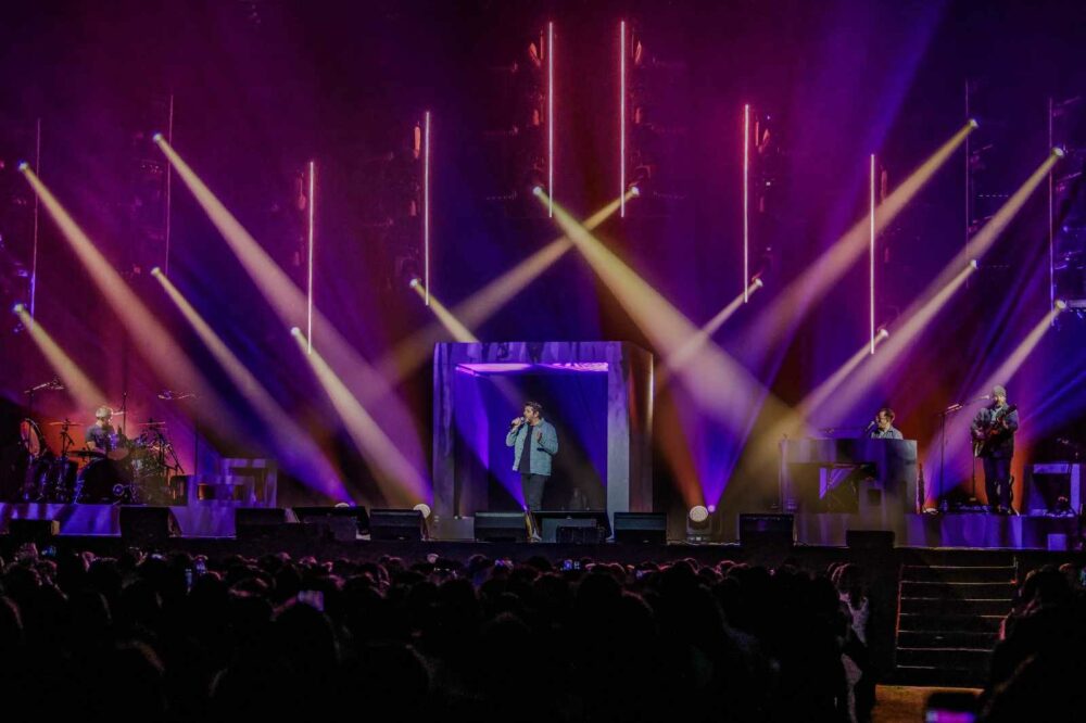 Dès les premières notes, l’atmosphère s’est électrisée avec l’arrivée sur scène de Patrick Fiori. Tel un maître de cérémonie moderne, il a pris place dans une guérite au centre de la scène, revêtu d’une veste en jeans, annonçant ainsi le début d’un spectacle où le chant est roi. « Le Chant est Libre », titre évocateur à la fois de sa tournée et de son dernier album, a ouvert le bal dans une ambiance vibrante.