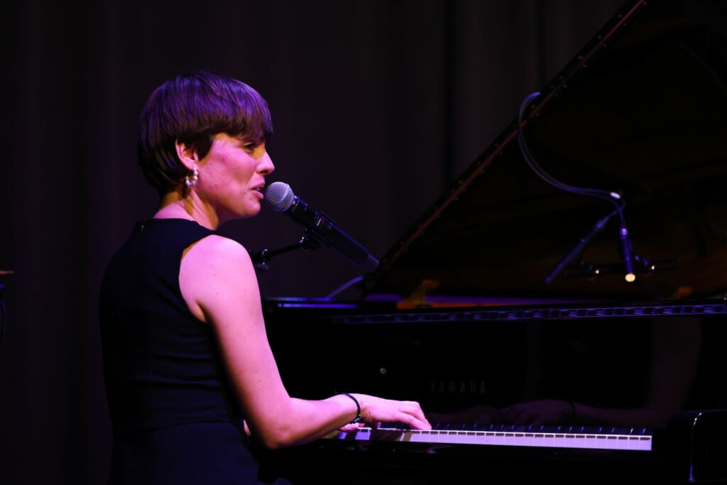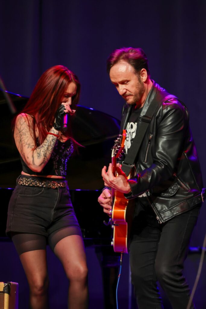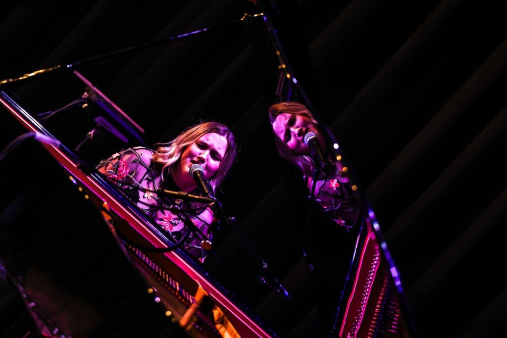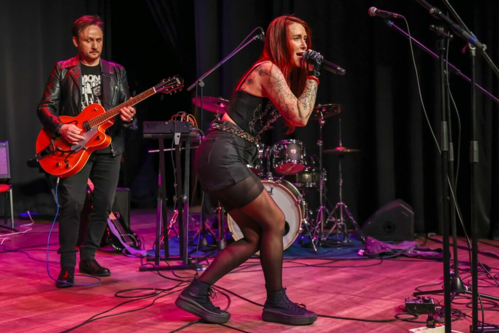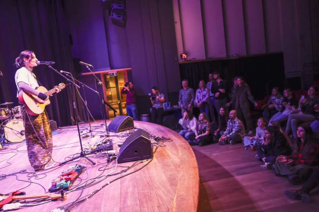 Accompagnée sur scène par Matt John Stone (guitare) et Max Montagne (sur son « pad », Le pad en sonorisation est un atténuateur de signal audio intégré avant la préamplification. Il permet de réduire le niveau d’entrée, souvent de 20 dB, pour éviter la saturation des préamplificateurs et préserver la fidélité du son, particulièrement lors de sources puissantes comme les micros de batterie ou d’ampli guitare. En musique, le pad décrit aussi une texture sonore douce et harmonique utilisée en arrière-plan pour enrichir une composition sans empiéter sur la mélodie principale. ), elle livre un moment intense. Les fans sont là. Présents. Engagés. Et ça se voit.