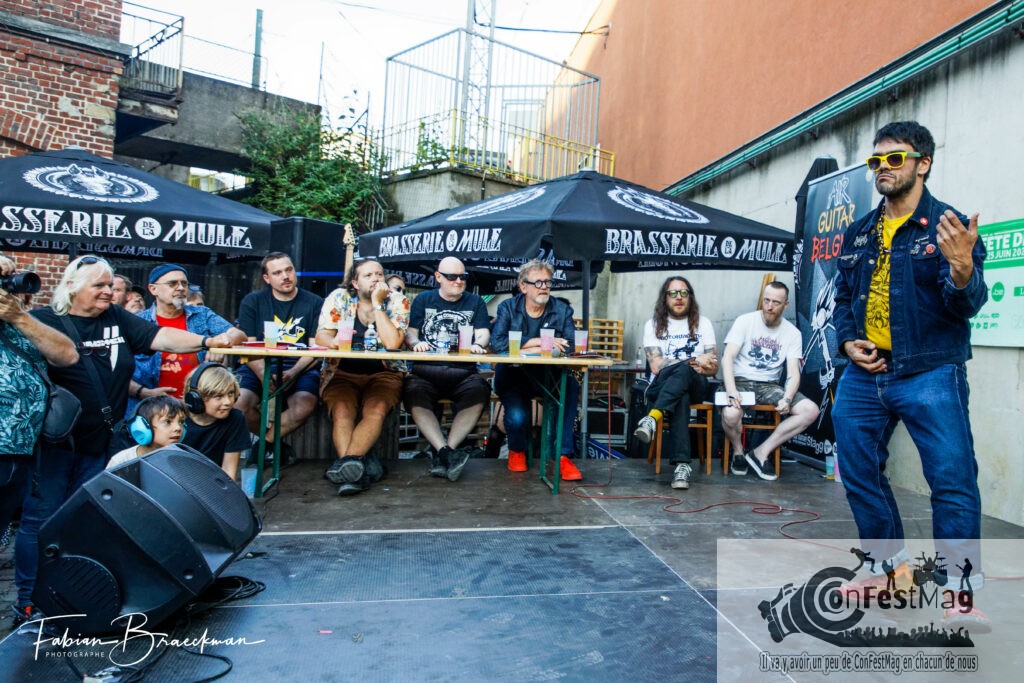 …et concerts live de Romano Nervoso et VHS from Space ! La Brasserie de La Mule était ce samedi « the place to be » dans une ambiance de folie et sous un soleil de plomb. Il y a peu nous vous annoncions dans ces colonnes la demi finale du Championnat de Belgique de Air Guitar, événement qui a eu lieu samedi dernier à La Brasserie de la Mule à Schaerbeek. La météo estivale ainsi que l’affiche proposée ce jour là avec les concerts de Romano Nervoso et VHS from Space ont attiré la grosse foule. Il est passé 18h lorsque Romano Nervoso s’empare de la scène extérieure devant une foule compacte. Dès les premiers accords l’ambiance est bon enfant et le public réagit au quart de tour aux titres énergiques du band et de son charismatique leader Giacomo Panarisi. Comme à son habitude le frontman déjanté et ses musiciens balancent leur spaghetti rock avec une belle dose d’auto-dérision et une énergie peu commune. Notre homme déclare avec humour détester les Stones mais nous dit qu’il va néanmoins reprendre un de leurs titres, puis nous envoie Come Together des Beatles à la tronche dans une version survitaminée. Cette blague il la fait souvent mais ça marche à chaque fois ! Romano Nervoso c’est du rock bien saignant et sans prétention from La Louvière, et l’assurance de toujours passer un excellent moment en leur compagnie. Après environ 1h de show, place maintenant à la compétition de Air Guitar. Le jury, dont j’ai l’honneur de faire partie, est également composé de Juan d’Oultremont, de Ross Demon, de Giacomo Panarisi, de Corentin Skwara et de son président Narvalwaker champion de Belgique 2011 et dans le top 10 mondial. Notre petit groupe prend place sur scène tablette à la main, et s’apprête à juger les 15 candidats qui vont défiler sous nos yeux pour une performance choisie d’une minute. Corentin alias Airgus, organisateur de l’événement et champion d’air guitar, présente et annonce chaque candidat, et c’est parti pour une solide partie de rigolade et de folie en deux manches devant des spectateurs déchainés. Quelle ambiance ! La grande finale, aura lieu le 8 juillet prochain, toujours à La Mule, et décernera le titre de champion de Belgique. Le gagnant ou la gagnante gagnera une vraie guitare Stagg, et aura l’occasion de partir fin aout en Finlande pour y représenter la Belgique aux Championnat du Monde. Rien que ça ! Vous trouverez ici via ce lien un bon résumé de l’ambiance de cette compétition de folie et les prestations complètes des candidats via la diffusion en direct sur Twich de L’Oeil Carnivore (Merci à eux !) : https://www.twitch.tv/videos/1854714907 (Merci à eux !) Il y eu donc en fin de parcours 10 qualifiés pour la finale, avec un duel serré pour la première place entre Dirty Beaujolais et la très charismatique Lulu La Landaise. C’est finalement Dirty Beaujolais qui s’empara de la première place avec 68 points contre 67.3 pour Lulu que le public a longuement ovationné et dont c’était la première participation. Bravo à eux, et à tous ceux qui ont participé à l’aventure ! Rendez vous donc le 8 juillet pour vivre l’épilogue de cette belle et enthousiasmante compétition atypique. Entre les deux manches de la compétition de Air Guitar, un deuxième concert était prévu cette fois sur la scène intérieure avec VHS from Space. VHS from Space est un band qui évolue au sein d’un univers retro-futuriste, et évoque le rock alternatif en y mêlant sa touche psyché-cosmique. Oups ! Après deux premiers EP sortis en 2014 et 2018 , le quintet a proposé en 2022 un troisième effort Cigarette Burns où il explore d’avantage les méandres futuristes des nineties. Un vinyle est prévu à la rentrée pour le mois de septembre. Arborant un visuel scénique futuriste et inquiétant sorti tout droit d’un vaisseau spatial de l’angoisse, le groupe dégage sur scène une puissance de feu réjouissante qui rappelle l’énergie du rock garage. Il n’y avait qu’à observer le public totalement déchainé pour se rendre compte de l’énorme impact live qui émane du groupe. Une reprise étonnante du Hallo Spaceboy de David Bowie s’est glissée dans la setlist au sein des compos originales comme Exquisite Shame, Trickster, DeLorean Thieves, Revenge, Causa Sui , Sound of Uranus, Vertigo , Dead Pilot et autre From Glory to Rust . On stage, le line up est composé de Jérôme Vandewattyne, guitares et voix, de Franz Vandewattyne à la batterie, de Maxime Ronce à la basse, de Fabrice Fardelli à la guitare et de Ayrton Heymans ( VJing et images ). Le band propose au public un spectacle complet auditif et visuel. Pour les musiciens de VHS from Space, une scène ce n’est pas que du son, c’est aussi de l’image. VHS from Space fut en ce qui me concerne LA révélation du jour, un groupe inventif, talentueux et créatif qui a tout pour un jour faire partie des grands ! Incontestablement un projet à suivre avec une très grande attention. Cette journée à la Brasserie de la Mule fut incontestablement une belle réussite, un de ces événements de plus en plus nombreux qui contribuent à faire de La Mule, le nouvel endroit branché zique qui a le vent en poupe. N’hésitez pas à aller leur rendre visite à l’occasion ! Jean-Pierre Vanderlinden / Photos Fabian Braeckman Article partagé en collaboration avec Branchés Culture.com. Retrouvez l’article original via ce lien : https://branchesculture.com/2023/06/28/air-guitar-belgium-championship-et-concerts-de-romano-nervoso-et-vhs-from-space-la-brasserie-de-la-mule-etait-ce-samedi-the-place-to-be-dans-une-ambiance-de-folie-et-sous-un-soleil-de-plomb/