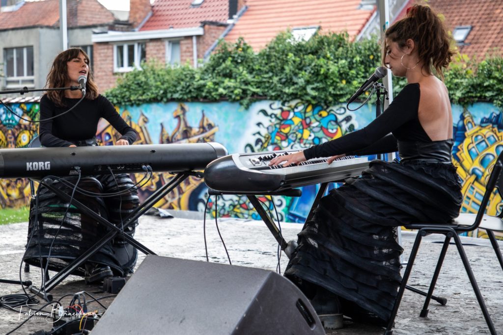 Y aura pas de problème au niveau mémoire future,… les vacances estivales 2021 sur la Belgique, resteront une ancrée « genre pourrie »…côté météo s’entend. Heureusement, diverses organisations (Hello Summer, Escale du Nord à Anderlecht, ….)se seront données la peine d’ organiser des événements gratuits (juste réserver…)pour nous faire découvrir des artistes belges de l’ombre, pleins de talents. En ce jeudi « d’ automne » de fin août… Au pied du très joli clocher de Saint Guidon, l’esprit morose influencé par le temps, nous nous installons aux tables, agréablement séchées par les organisateurs et entre les gouttes qui se transforment en averse locale. Tout à coup l’ eau bénite de Saint guidon, se transforme en timides rayons de soleil entre les nuages. Alors que retentissent les premières notes de Juicy… Les deux synthés et deux jeunes et jolies filles nous épatent avec le premier titre…Je vais pas vous mentir l’équipe de confestmag au tout premier rang connaissait déjà les deux artistes. Une première fois ce fût a la présentation presse des Nuits Botanique, mais aussi à la Ferme du Biéreaux en avant-première de Tanaë. Sur une grande scène, c’est le spectacle garanti, de la part de Sasha et Julie maniant les voix et les mimiques comme personne, changent de costumes en nous gratifiant aussi de petits moment physiques assez impressionnants. Cette fois ce fut plus intimiste, ce qui n’enlevait rien à l’énergie de leurs nouveaux morceaux, que l’on découvrira bientôt sur un album en passe de sortir éminemment dans les bacs. Quand je vous le disait, en début de reportage, le soleil ne nous a plus quitté, jusqu’au final ou tout le monde à pu reprendre en choeur une version de « la boulette de Diams » de toute beauté et qui laissait entrevoir leurs envies de folies bien contenue et c’est dommage… Juicy donne rendez-vous aux amateurs et aux curieux aussi, avec une certitude de passer un bon moment (ndlr), aux Nuits Botanique 2021, le Vendredi 10 septembre 2021… avec un orchestre symphonique …ce sera génial réservez ici https://www.facebook.com/events/523581268191856 Hâte d’y être Textes et photos BRAECKMAN Fabian