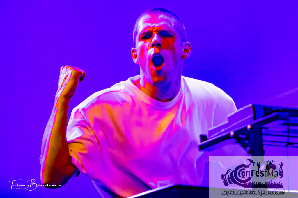 Le chanteur Hervé vient de publier « Hyper », un premier album à l’âge de 28 ans, lui qui s’est lancé dans la musique, 10 ans plus tôt. Il a l’habitude de tout manager seul de l’élaboration des chansons aux clips, en passant par les pochettes. Après cette phase solitaire, il prend son van et accompagné de ses musiciens, il se rend sur scène afin d’aller y chercher une forme de performance physique. Sa musique, on peut la décrire comme électronique, avec la présence de basses et de batterie qu’il affectionne. Il parle à travers ses textes de tous les sujets, mais n’a pas forcément envie que le public les comprenne, mais qu’ils en fassent leur propre interprétation. Même s’il a grandi et vit à Paris, il est de sang breton et c’est là-bas qu’il élabore ses disques, et l’ensemble de ses projets. Il y a même passé le confinement alors qu’en principe pour écrire il a besoin de partir car il écrit mieux sur son temps quand il prend ses distances avec lui. Quand il vient dans la région, il lui arrive de louer une maison car composer avec des machines, engendre le bruit. Il avoue vivre au jour le jour surtout depuis la pandémie et ses concerts affichent complet, mais peu lui importe de toute façon le nombre de public, le principal pour lui c’est le sentiment de résistance qu’il ressent et surtout que les gens viennent même avec des masques de circonstance, même assis car lui et son public ne lâchent rien. Clara Luciani et Eddy de Pretto, deux étoiles montantes de la chanson francophone lui ont même donné leur faveur , très probablement parce-qu’ils sentent ses chansons, et qu’à leur image il est un vrai chansonnier avec une posture dite moderne. Dehors il fait froid, venteux et humide… Alors les équipes du Bota ont d’abord pensé au conforts de ses spectateurs. Le Covid laissant déjà assez de malades sur Bruxelles, ça suffit ! Fallait pas que les amateurs d’ Hervé et de Charles se retrouvent en congé forcé. Les consignes usuelles de préventions, les musicos en place et « c’est parti pour le show …. ». Hervé sautillant prend place derrière le clavier, sautant bougeant dans tout les sens, dansant, grimaçant… La tornade était en fait à l’intérieur ! Comme si , il a garder en lui toute l’énergie pour se déchaîner pour ses 2 concerts successifs de même acabit. Véritable boule de nerfs, toujours en mouvement derrière son clavier, communicatif pour ce public tout dévoué même assis et claquant des pieds à faire trembler le théâtre. Tout cela dans les normes et aucun débordement faut le signaler… Voix atypique , à la limite du chuchotement, musiques électronique super entrainante, textes quelquefois incompréhensibles, mais très attachant et autant il peu grimacer durant ses morceaux, autant il rigole a chaque moments qu’il s ‘adresse au public. On a même eu droit à un morceau volé à Bashung , « La Peur des Mots », mais qui lui sied à merveille. Le concert malheureusement raccourci fut trop court même pour lui et les remerciements d’ Hervé et ses musiciens en témoignent… Super concert, un petit coup de coeur pour une nouvelle découverte, Confestmag a adoré. Biographie COCU Christophe Résumé et Photographie BRAECKMAN Fabian