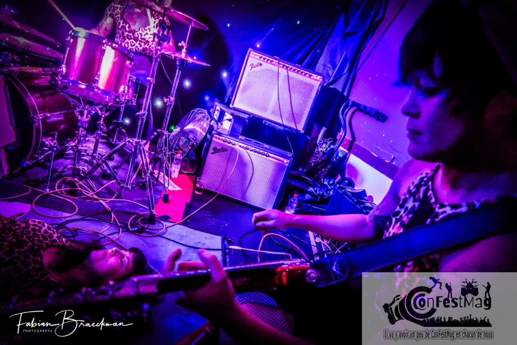 L’évènement punk-garage avait lieu il y a quelques jours à la Perle, une toute petite salle nichée au bout d’un couloir exigu d’un bistrot de la place Emile Bockstael. C’est là que The Darts from Arizona (USA) ont donné un concert pour le moins énergique. Organisé par Make Trouble / Livingdeadpunks, Herman Verbeelen, Walter Vermander, Ronny Wijnant et Ella Viperella cette soirée s’intitulait Girls in the Garage. Oui mais voilà, trouver un band de filles pour jouer en support act de The Darts n’est pas chose facile et au final les organisateurs ont fait appel aux Chiff Chaffs qui pour la circonstance ont accepté de se fringuer en filles et d’être rebaptisés Chiff Chaff Dolls. Un challenge plutôt atypique à la limite du ridicule pourtant assumé avec le sourire par ce très bon band qui malgré ces accoutrements outranciers a livré une très bonne prestation de psychotic rock n’roll, et d’instru-mentals and teeth-grindin’ garage beats. Je ne connaissais pas le groupe avant ce soir là et j’ai été rapidement séduit par leur énergie communicative et leurs compos efficaces, au point que je suis reparti avec leur premier LP à la pochette très réussie et attractive intitulé Up To No Good et sorti sur le petit label TrashWax. Gilles, Nolf Kaka, Autys et Jan T. Flyer en ont visiblement sous le pied et méritent qu’on suive leur futur parcours avec attention. Allez les écouter sur leur bandcamp et venez les voir en live, vous ne serez pas déçus! Après un petit break bien nécessaire vu la petitesse du lieu qui personnellement ne m’a pas vraiment convaincu ( bonjour les normes de sécurité avec pour toute sortie un couloir étroit qui permet le passage d’une personne à la fois !), c’est au tour des Darts de monter sur scène. Ces quatre nanas dont Nicole chanteuse épileptique et bondissante est la principale attraction, les autres filles restant bien plus statiques, balancent un garage punk rock bien typé qui vous fait hocher de la tête et frapper du pied. Bourrée de sludgy guitars, d’un orgue menaçant, d’une batterie rageuse et de vocaux bien trempés, la musique des Darts n’a pas tardé à rendre le public très chaud ce qui a donné lieu à quelques pogos épiques. Dans cette salle mouchoir de poche, c’était assez folklorique, et je ne vous parle pas de la chaleur étouffante ! Bref les Darts on tenu leur promesses avec un show bien nerveux et déjanté, malgré le fait que leur chanteuse était souffrante la veille et que le concert de Bruxelles a failli être annulé en dernière minute. Merci à elles pour ça. Personnellement, même si j’ai hautement apprécié le show, je trouve que leurs titres sont assez linéaires et manquent un peu de relief, mais il s’agit d’un avis personnel qui n’engage que moi. Bravo néanmoins aux deux bands de la soirée, et aux organisateurs qui font vivre régulièrement le punk rock-garage et la musique alternative dans des lieux parfois atypiques, mais toujours avec autant de passion. Depuis la fermeture temporaire du Magasin 4, il est bon de pouvoir aller applaudir régulièrement des bands alternatifs souvent formidables mais moins médiatisés, dans des formules démocratiques avec un petit prix d’entrée ou souvent payés au chapeau. Une initiative à soutenir au plus haut point ! Jean-Pierre Vanderlinden / Photos des Darts Fabian Braeckman Article partagé en collaboration avec Branchés Culture.com. Retrouvez l’article original via ce lien : https://branchesculture.com/2023/09/26/the-darts-et-chiff-chaffs-a-la-perle-une-soiree-hot-au-propre-comme-au-figure/